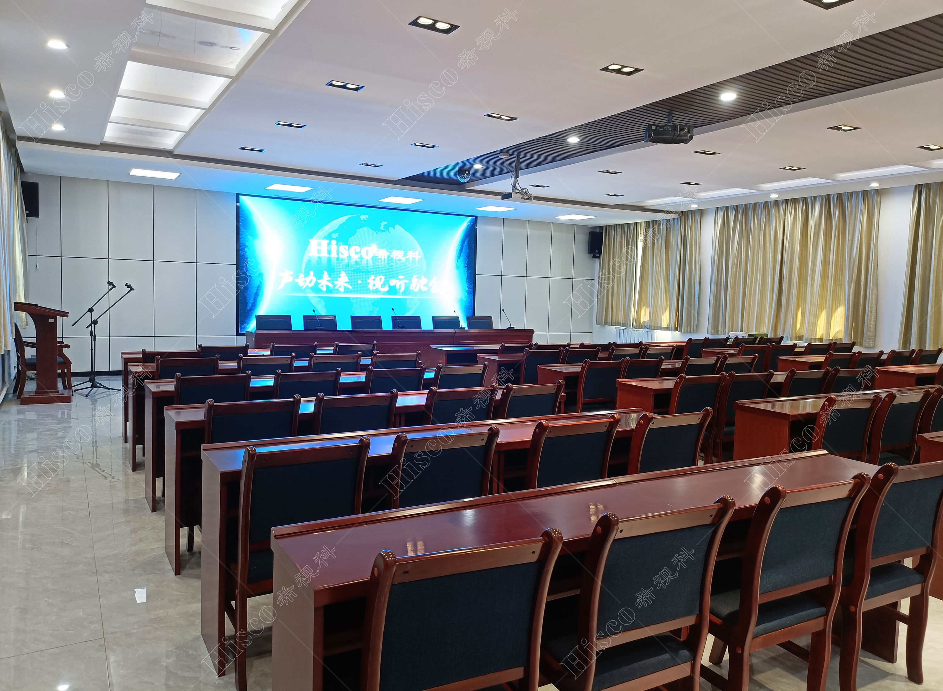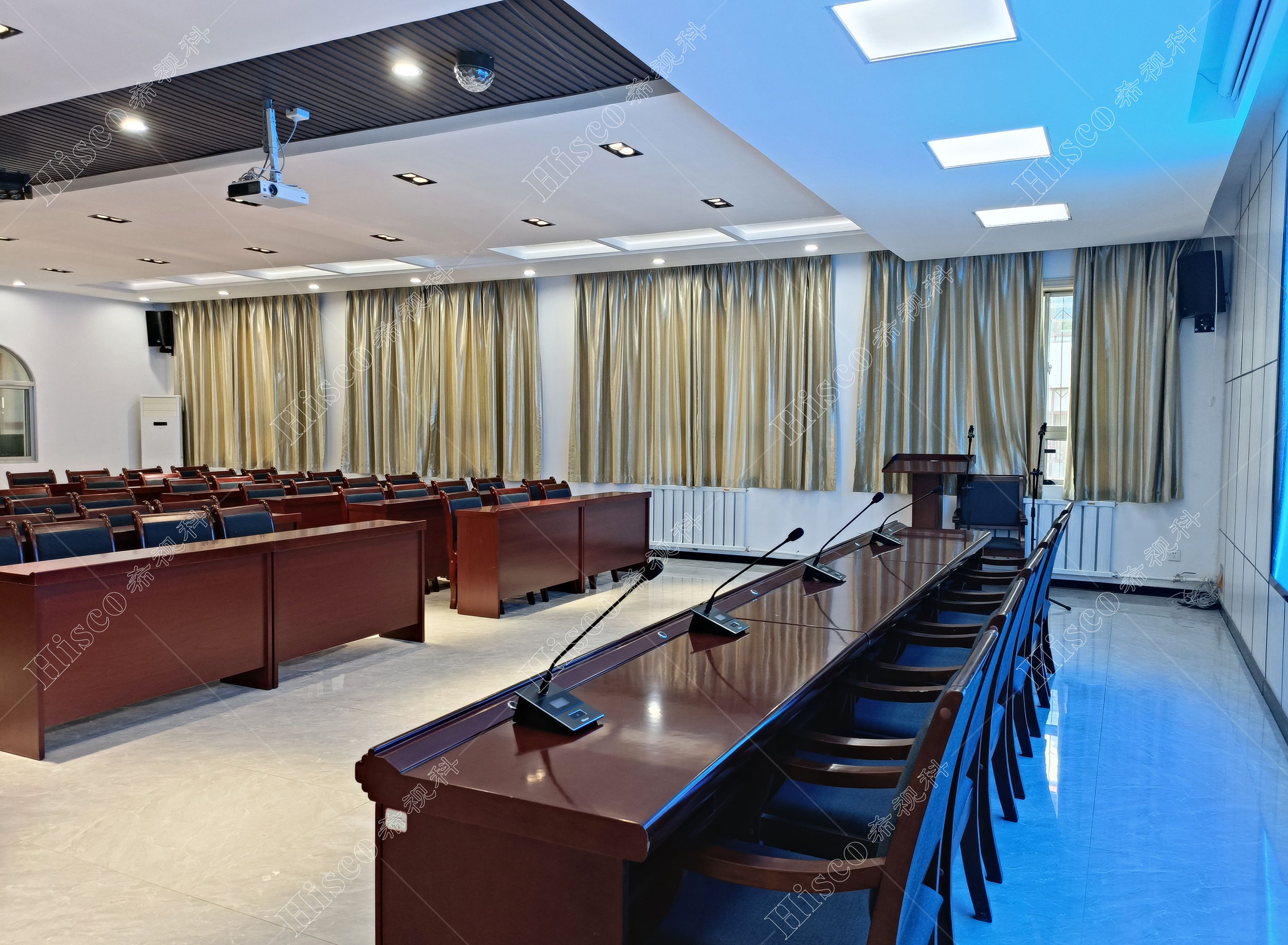 随着当今科技的飞速发展,老式的会议形式已无法适应现代化会议系统的要求。现代化的数字会议系统会议程序简单化、功能多样化,能够对会议实施控制、管理,包括声音传送稳定纯正,讨论清晰有序,使整个会议形式具有高效性。本次会议室设计采用数字会议系统,扩声系统、显示系统、集中控制系统、矩阵系统、无纸化升降等,实现会议室的多媒体会议功能,满足简洁流畅的会议过程、逼真传神的听觉效果、清晰舒适的视频显示、智能的摄像跟踪、媒体音视频信号源矩阵切换和中央集成控制等要求