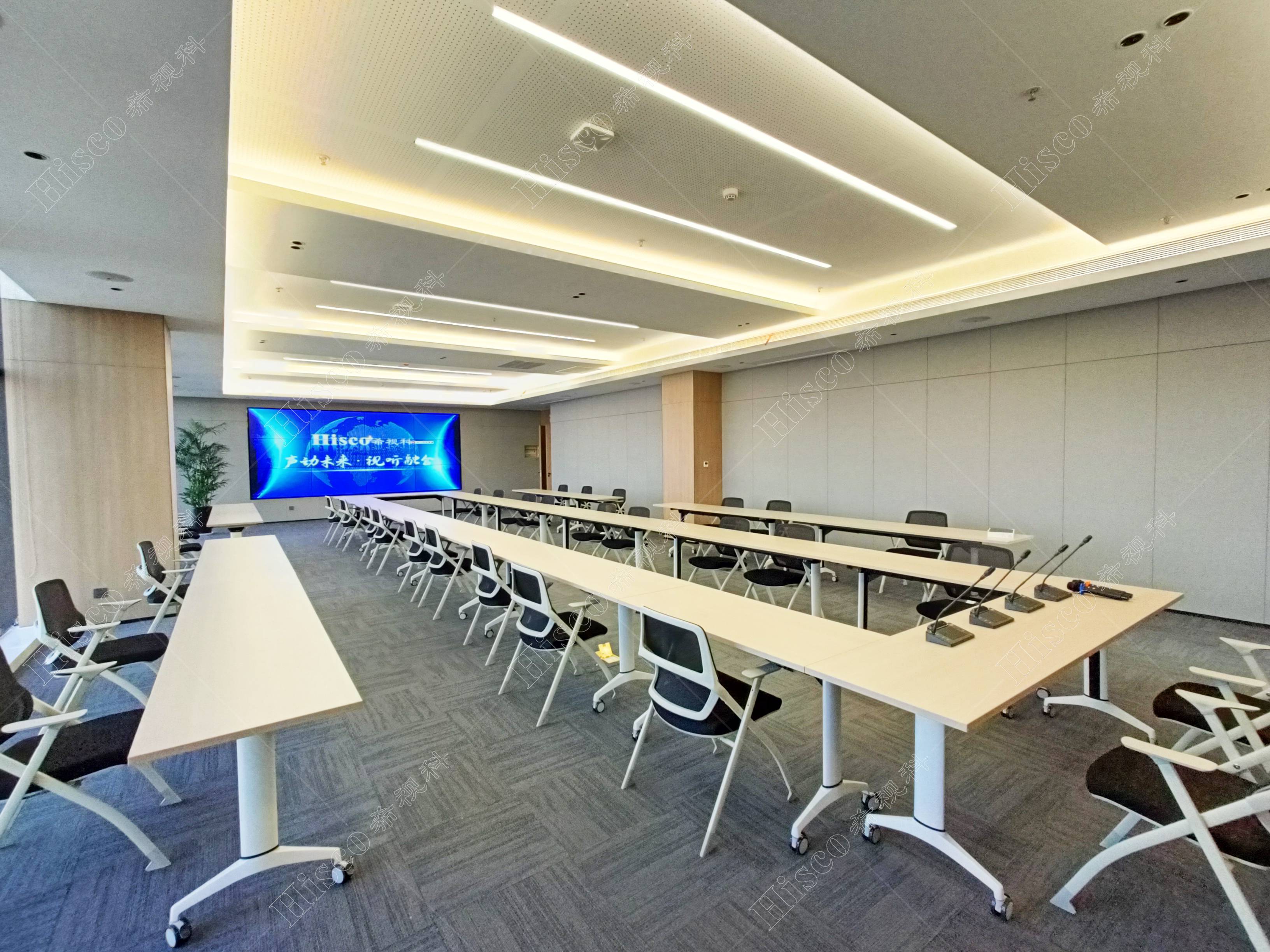 会议室内需要建设扩声系统、会议系统、显示系统,智能化系统等,主要满足日常开会的讨论、发言等等。综合礼堂的设计,追求语言的清晰度和饱和度,声压级级要求达到国家厅堂扩声系统一级标准。同时预留了丰富的接口,方便以后系统的扩展,实现整个系统的强大功能。