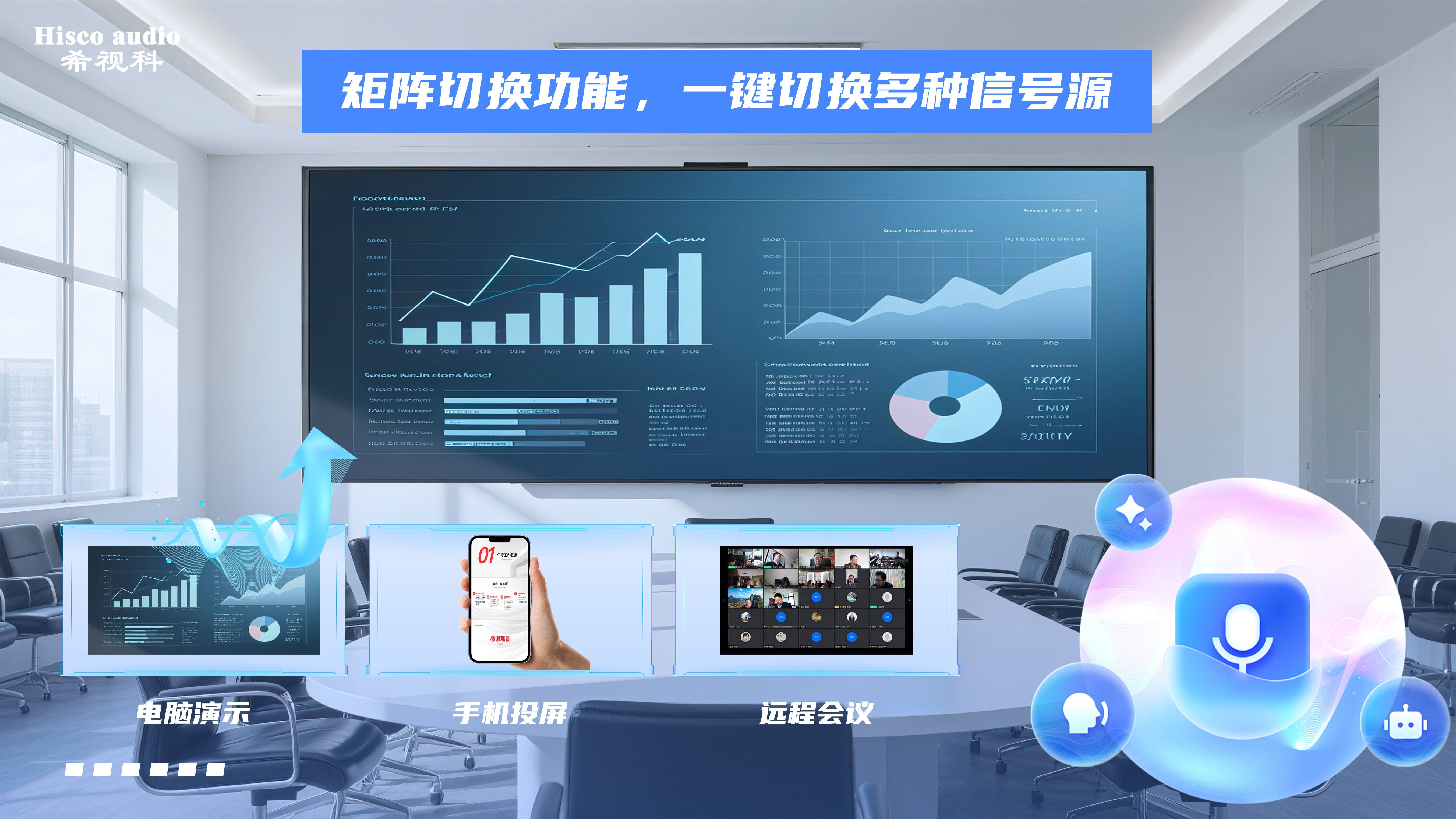 支持多路音视频信号接入,无论是电脑演示、手机投屏,还是远程会议平台画面,都可以一键切换,告别传统设备复杂的操作流程,让会议内容展示更加流畅自然。