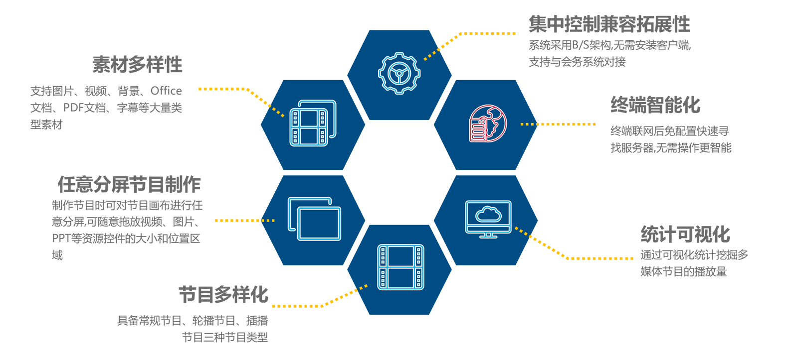 多媒体信息发布系统默认支持常见的音频、视频、图片、文档格式的素材.同时为满足各行业针对多媒体信息发布系统的兼容拓展需求,开放数据对接接口,实现对第三方系统的对接和拓展需求: