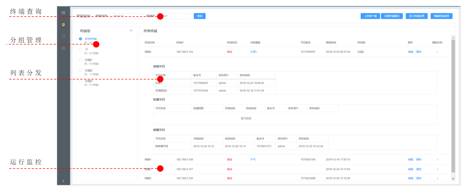 终端管理功能模块主要实现在文件发布的时候对播放终端的控制和管理,包括对同一个系统中不同的显示设备类型的设置管理,可以以组的方式实现终端的同步和异步播放。